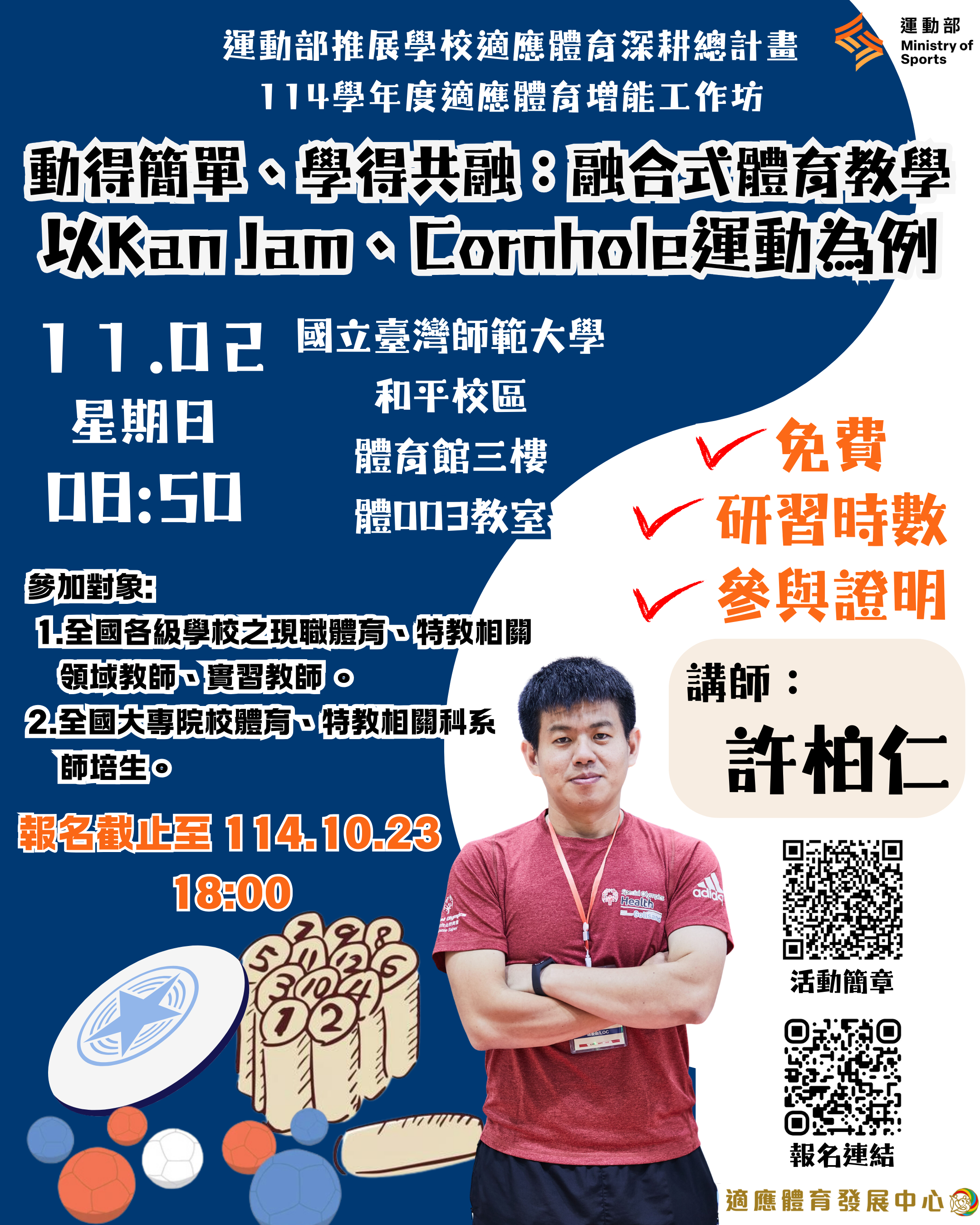114學年度適應體育增能工作坊─動得簡單、學得共融:融合式體育教學,以Kan Jam、Cornhole運動為例